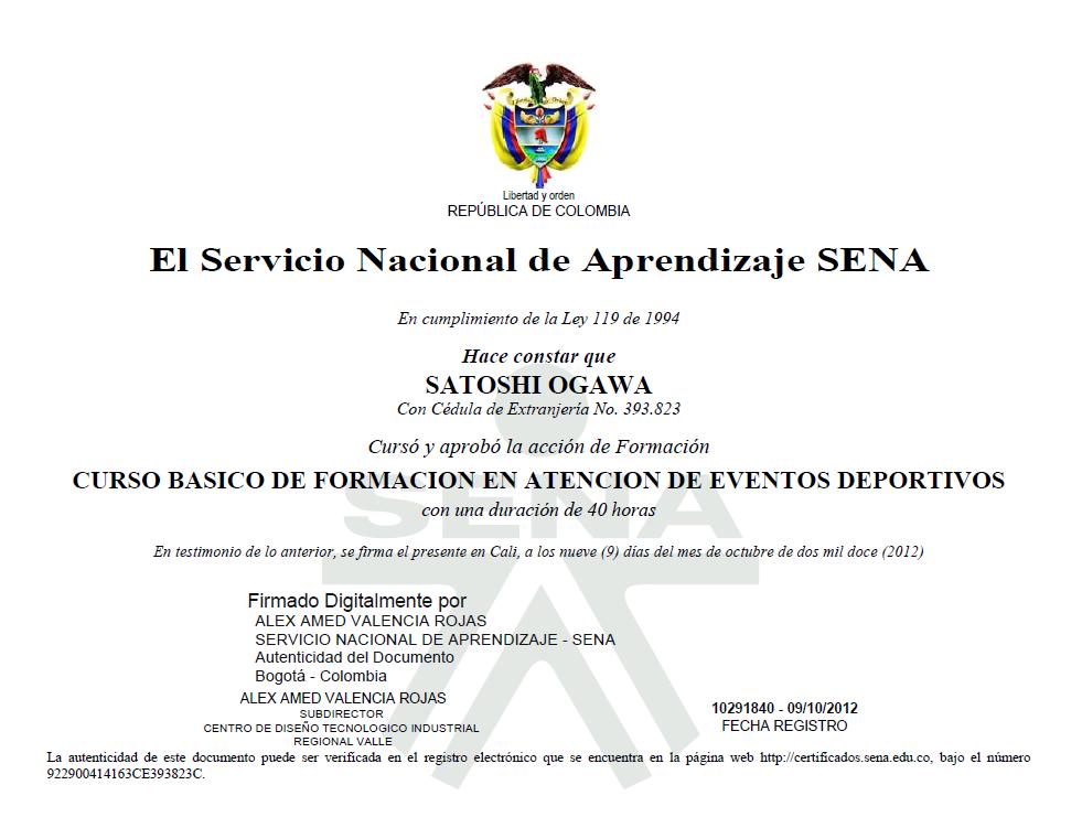 コロンビアでのライフセービング協会の立ち上げを目標に授与された賞状