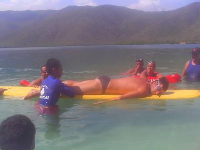 最後はヒューマン・チェーンを使っての捜索作業の練習。ヒューマンチェーンを使って、重りの入った箱を探すという課題だったのですが、水が透き通っていたのもあってベテラン・ライフセーバーにあっという間に見つけられてしまいました。彼いわく若い頃、50メートルプールに20ドル札を落としてよく練習したとのこと。普通ではない環境を自ら作り、その水の動きを観察することで、目は鍛えられるとのことでした。彼の監視の能力には圧巻です。