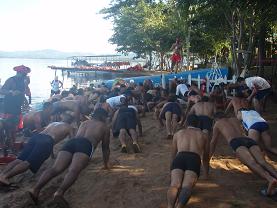 反省の腕立て:時間通りに全員が集まれなかったり、返事の声が小さかったり、指示通りできなかったり何かあるたびに“ライフセーバー”と叫びながら腕立てをさせられます…