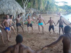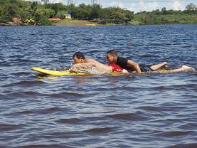 ベネズエラ定番のアレパ(とうもろこしの粉で作ったパン)を食べていよいよ講習の始まりです。本日のメインはチューブレスキュー。軽溺、重溺の1マン・レスキューをひたすら練習しました。もちろんフィットネスも大事と言うことで、溺者役が沖に到着するまでレスキュアーは腕立てなどのトレーニングです。とは言え、午後には普段から鍛えている強者の腕もパンパンになってきたので、後半はみんなで“なかよし”になりました(笑)。