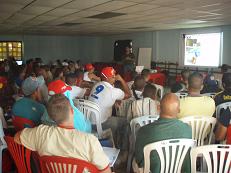 私が合流したのは学科とCPRの集中講習の最終日午後3時。講習会会場を訪れた私が見たのは真剣にスライドに目を向ける76名の受講生。ライフセービングフォーラムやリーダーズキャンプを思わせる人数に戸惑いを隠せませんでしたが、100人規模で行われる現地ライフセービング協会主催の講習会では決して多くないとのことでした。(浜主催の講習会は30人程度で行われます。)